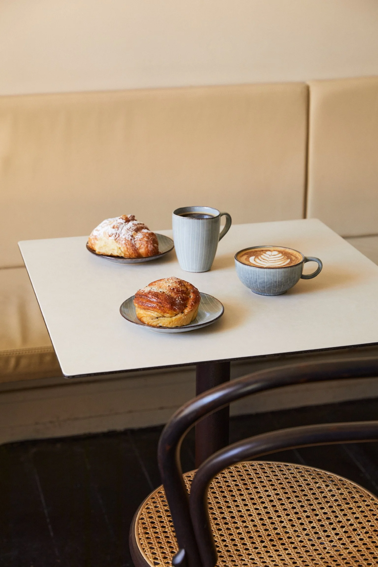 Indretningen er skabt i samarbejde med det Stockholmske Note Design Studio og byder på lyse, moderne rammer med bløde toner og grafiske gulve – en rolig oase midt i bylivet, omgivet af arkitektoniske detaljer og grønne omgivelser. Uanset om du sidder ude eller inde, er du midt i et levende nyt kvarter, hvor historien møder nutiden.