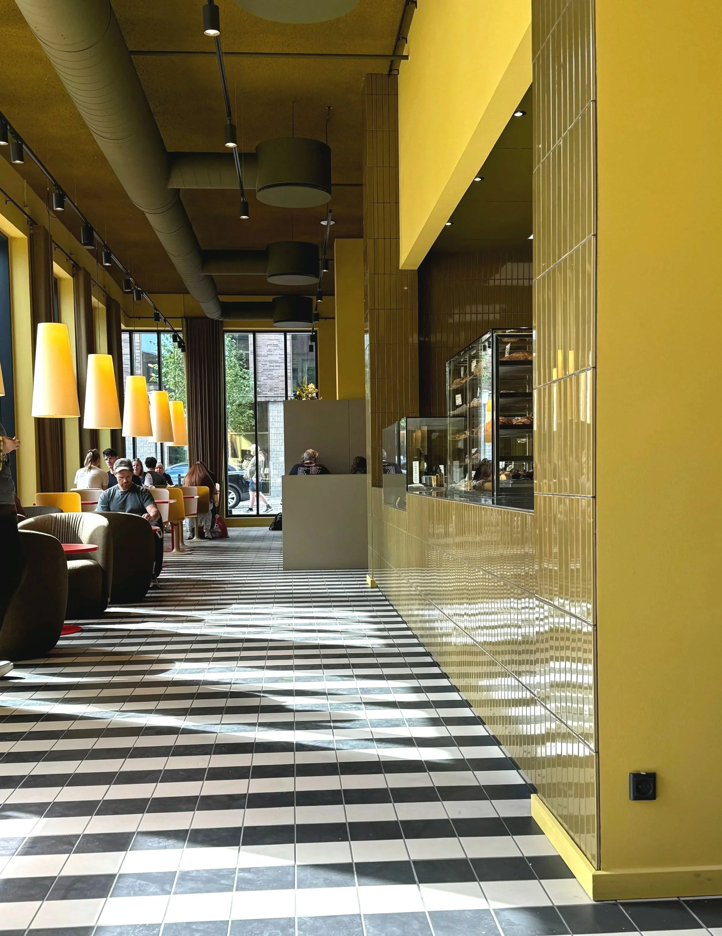 The interior, created in collaboration with Stockholm-based Note Design Studio, is light and modern with soft tones and graphic flooring – a calm, relaxed space set between city life, stunning architecture, and green surroundings. Whether you sit indoors or outside, you’re in the middle of a vibrant new neighborhood where history meets the present.